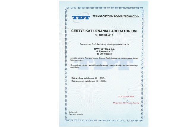 Wielu spośród naszych wieloletnich klientów eksploatuje konstrukcje, będące pod nadzorem Transportowego Dozoru Technicznego. Chcąc zacieśniać tą współpracę i zaoferować klientom kompleksową obsługę w zakresie badań nieniszczących, postaraliśmy się o uzyskanie certyfikatu uznania laboratorium. Laboratorium Navitest jest uprawnione do wykonywania badań radiograficznych, ultradźwiękowych, magnetyczno-proszkowych, penetracyjnych i wizualnych na konstrukcjach będących pod nadzorem Transportowego Dozoru Technicznego.