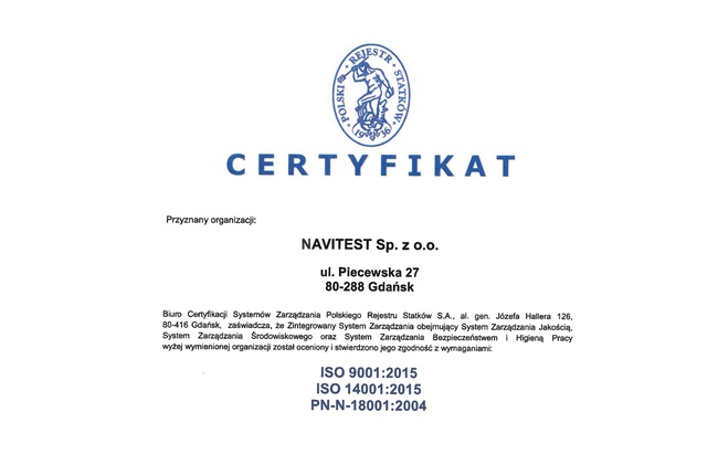 Z dumą informujemy, że nasz Zintegrowany System Zarządzania zyskał uznanie Biura Certyfikacji Systemów Zarządzania Polskiego Rejestru Statków i jego zgodność z wymaganiami norm ISO 9001:2015, ISO 14001:2015, PN-N-18001:2004 została potwierdzona certyfikatem nr NC-2949.