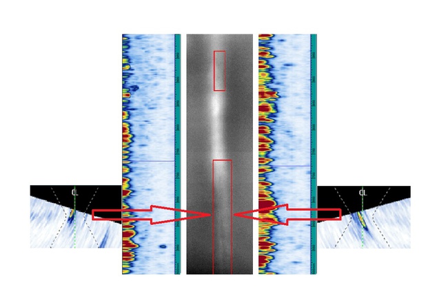 Tam, gdzie badania RT stają się prawie niemożliwe do wykonania, ultradźwiękowa technika Phased Array UT-PA staje się idealną alternatywą. Na zdjęciu poniżej przykład badania RT instalacji wypełnionej wodą, gdzie ze względu na medium, brak przetopu jest niemal niewidoczny. Metoda UT-PA daje czytelny obraz niezgodności oraz łatwość interpretacji wyników dla operatora.