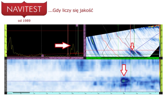 Na zdjęciach badanie ultradźwiękowe Phased Array ukierunkowane na pęknięcia w rejonie złącza. Jak widać jesteśmy w stanie znaleźć i zwymiarować nawet zamalowane podtopienia i odróżnić niezgodności produkcyjne od eksploatacyjnych.