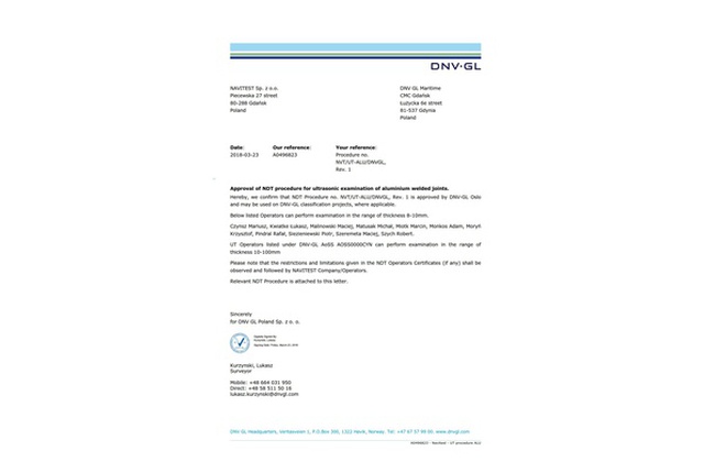 Kolejny raz udało nam się poszerzyć zakres badań, które możemy wykonywać pod nadzorem DNVGL. Właśnie otrzymaliśmy potwierdzenie uznania naszej procedury badań ultradźwiękowych złączy spawanych elementów aluminiowych w zakresie grubości 8-100 mm.