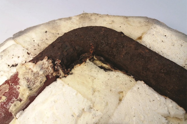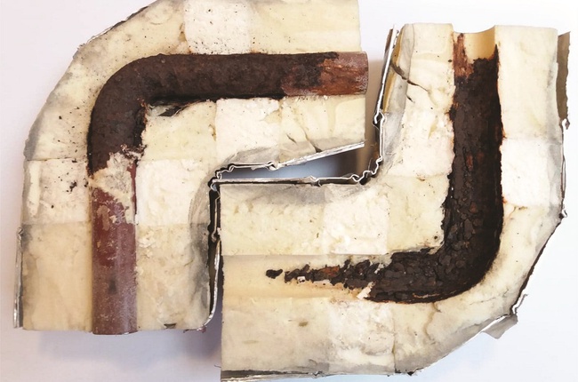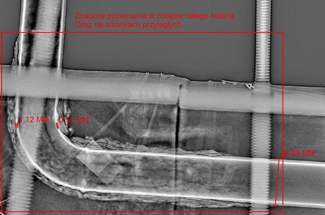 Kolano to uległo korozji i zostało wycięte z instalacji. W najcieńszym miejscu grubość jego ścianek wynosiła 0,5mm. Produkty korozji są doskonale widoczne zarówno na radiogramie jak i na zdjęciach.